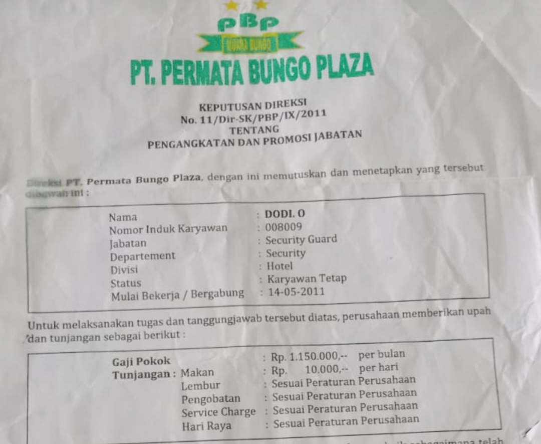 “Pihak Karyawan PT permata Bungo Plaza Hotel mengadukan masalah gaji tidak sesuai dengan kontrak kedinas Nakertras Bungo 18/05/2025.