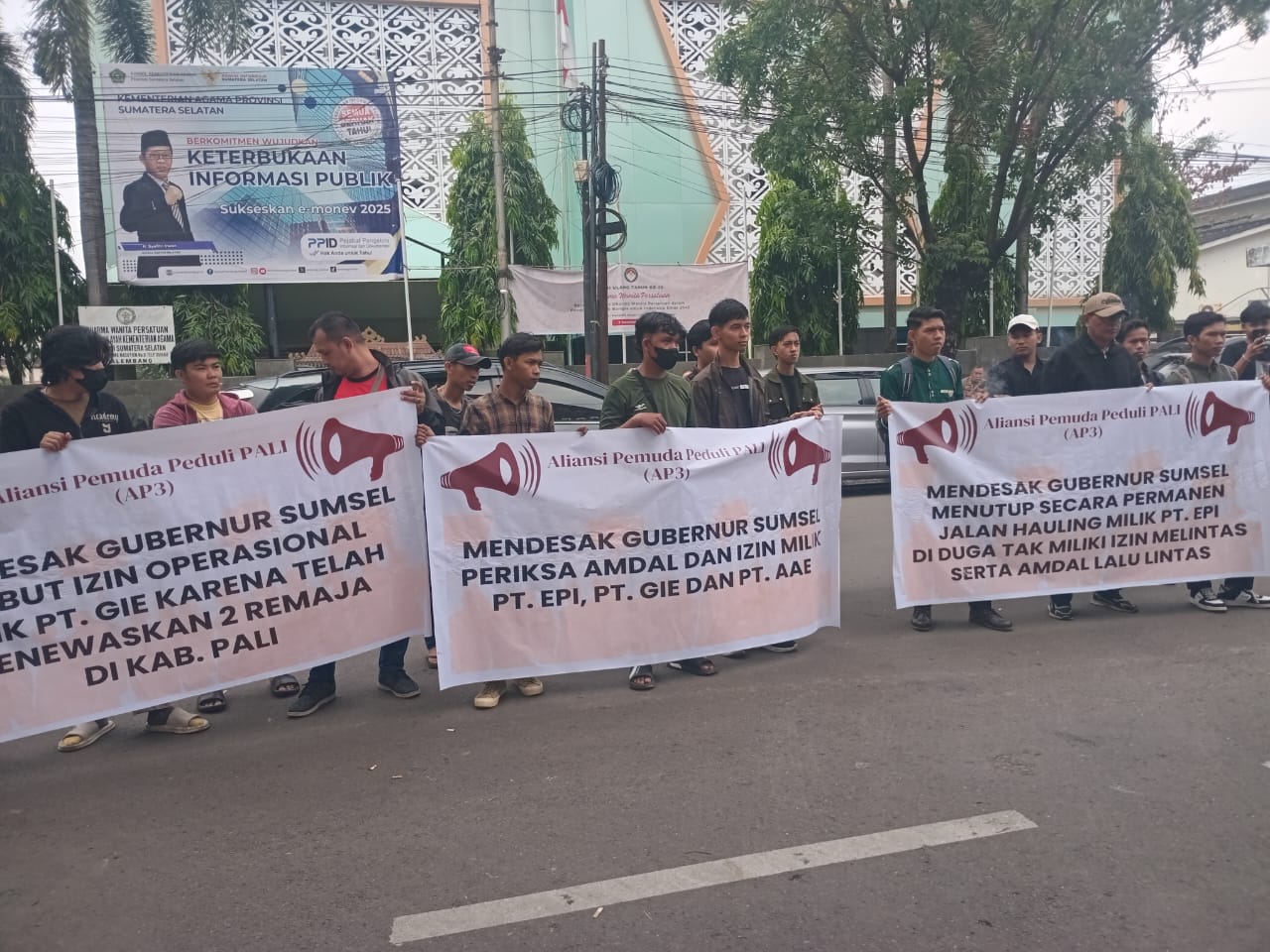 Aliansi Pemuda Peduli Pali (AP3) menggelar aksi damai di Kantor Gubernur Sumsel, berlokasi di Jalan Kapten A Rivai, No.3 Sungai Pangeran, Kecamatan IT. I, Palembang.